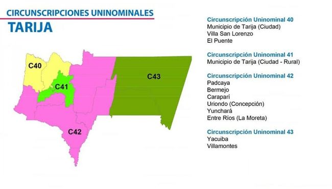 Las circunscripciones uninominales correspondientes a Tarija son la C40, la C41, la C42 y la C43.